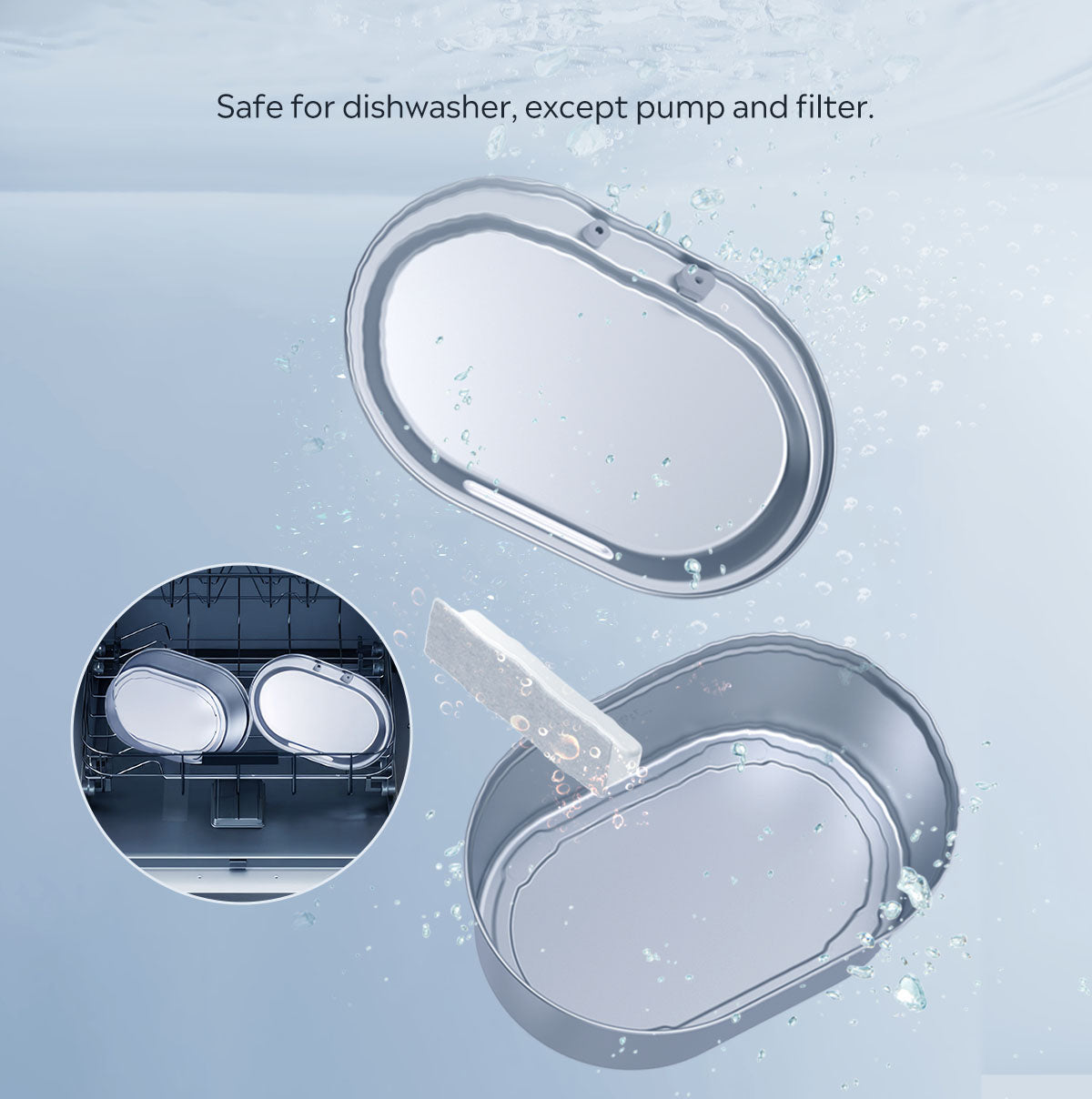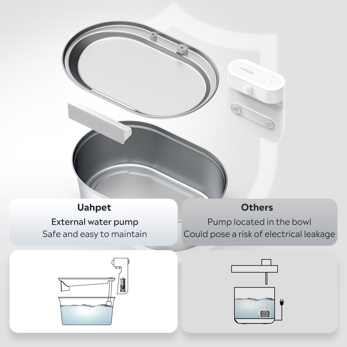 No pump in the bowl. Just the external water pump for easy setup, cleaning, and electrical leak-proof protection—keeping your furballs safe.
