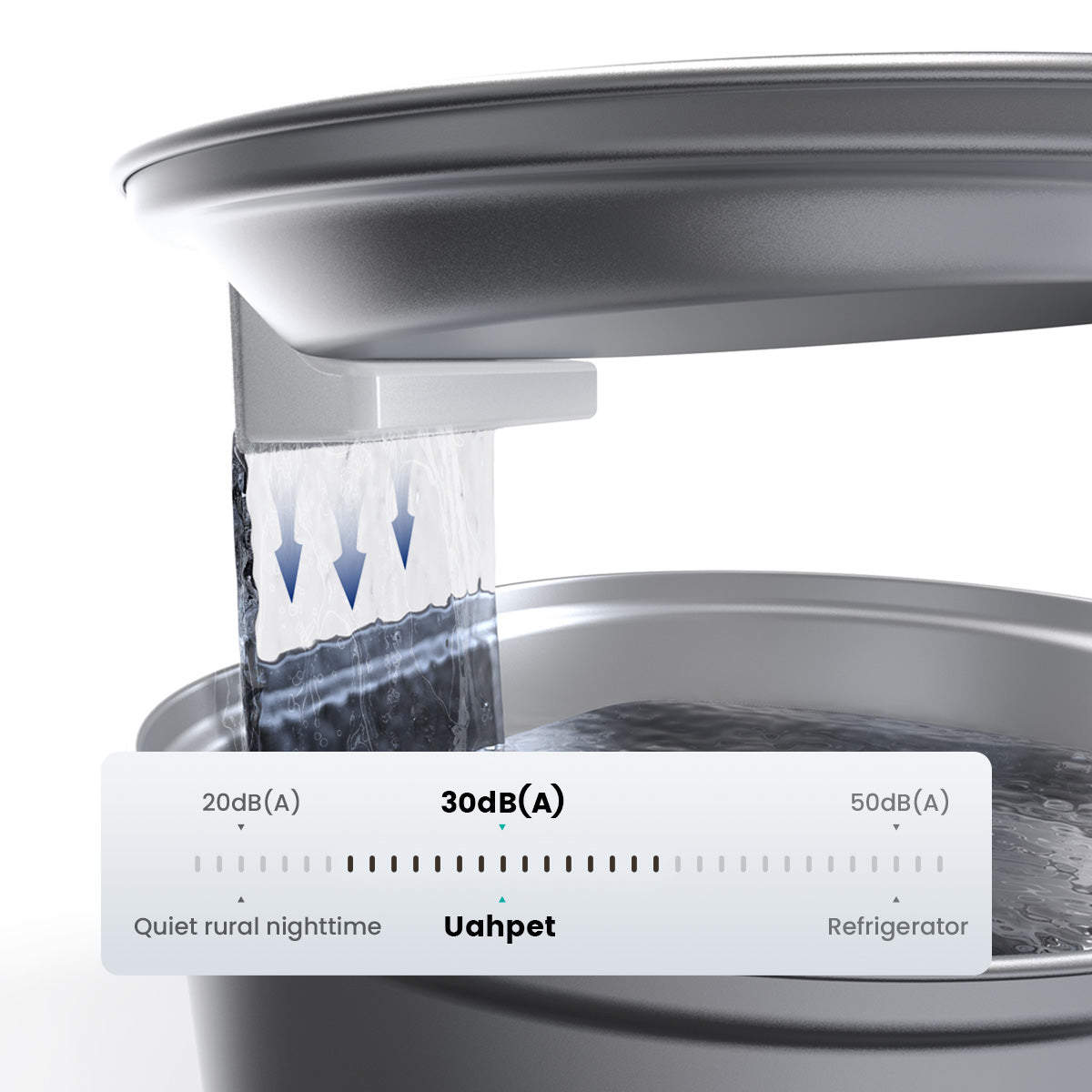 Designed with thoughtfulness, water gently glides along the inner wall of the bowl, reducing noise to under 30 dB. It seamlessly fits into your home, like a quiet helper. All you'll hear are the soothing purrs of content pets.