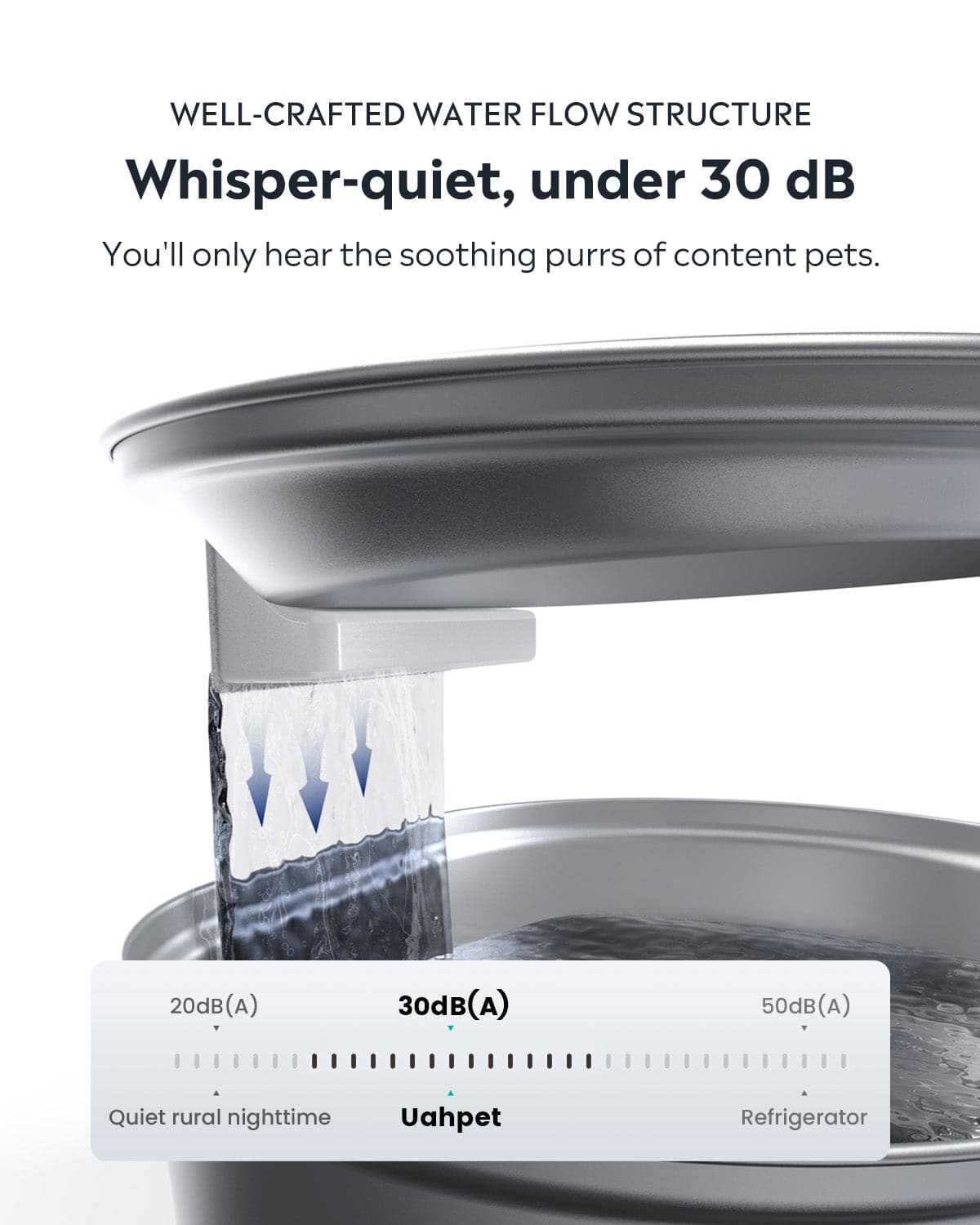 Designed with thoughtfulness, water gently glides along the inner wall of the bowl, reducing noise to under 30 dB. It seamlessly fits into your home, like a quiet helper. All you'll hear are the soothing purrs of content pets.