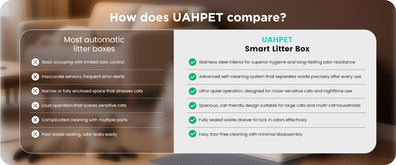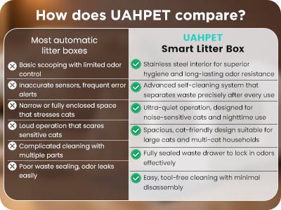 Uahpet automatically sifts waste after every use—no scooping required. Your cat always has a clean bed of litter, and you get valuable time back.