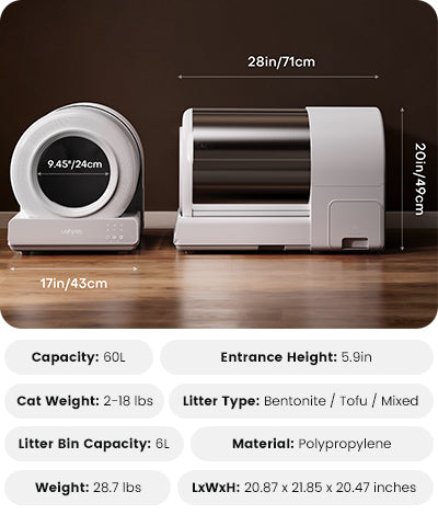The litter chamber capacity is 60L with a 150mm raised base and a wide 240mm entrance, making it easy for cats to enter and exit. It’s suitable for cats up to 10kg, allowing them to turn around comfortably. The cave-like design provides a natural, secure space for cats to use the litter box.