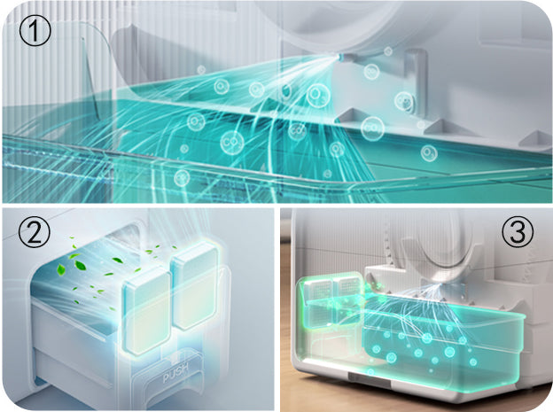 2. After your cat finishes using the box, it first covers the waste, then waits 8 minutes for clumping before starting the cleaning cycle.